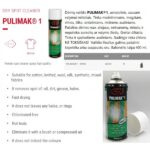 Dėmių valiklis PULIMAK®1 – aukštos kokybės aerozolinis, sausam valymui milteliais. Tinka medvilniniams, megztam, vilnos, šilko, sintetiniams, mišriems audiniams. Pašalina tepalines – riebalines dėmes, kitus nešvarumus, nepalieka aureolių ar valymo žiedų. Tinka ir spalvotiems audiniams valyti. Greitai džiūsta. Sudėtyje nėra chloro, ne toksiškas. Valiklio likučius nuo valomo paviršiaus galima pašalinti šepetėliu arba suspaustu oru. Balionėlio talpa 400 ml. Gamintojo šalis- Italija, Siliconi Commerciale Spa.